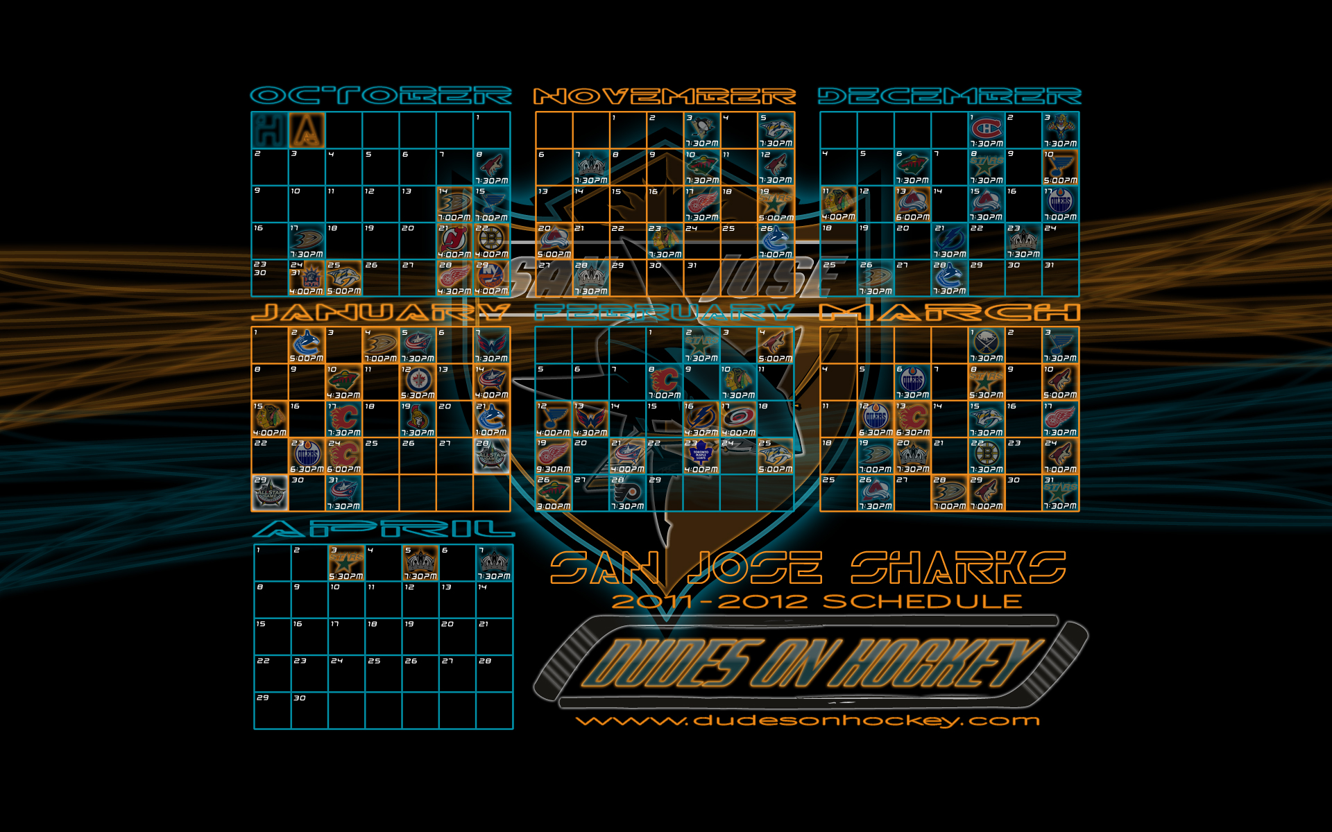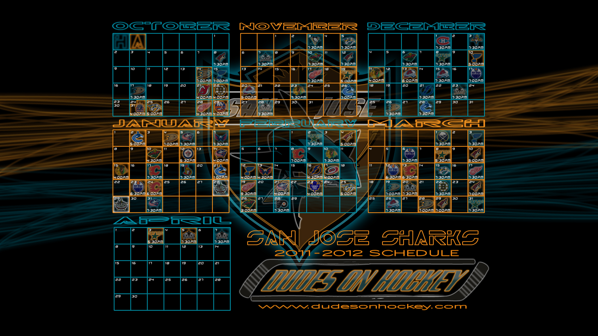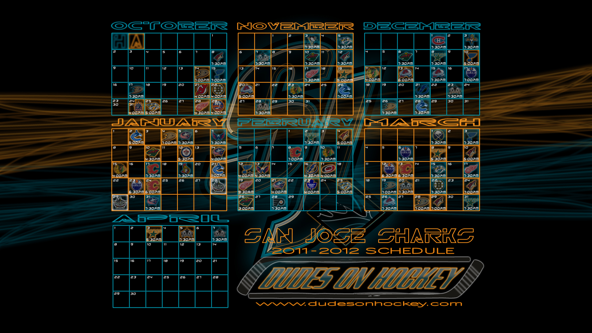 Thanks to my main man Bryce, we now have some desktop wallpapers of the Sharks’ 2011-2012 schedule. Four different backgrounds in two sizes. I’m partial to the diamond fin myself.