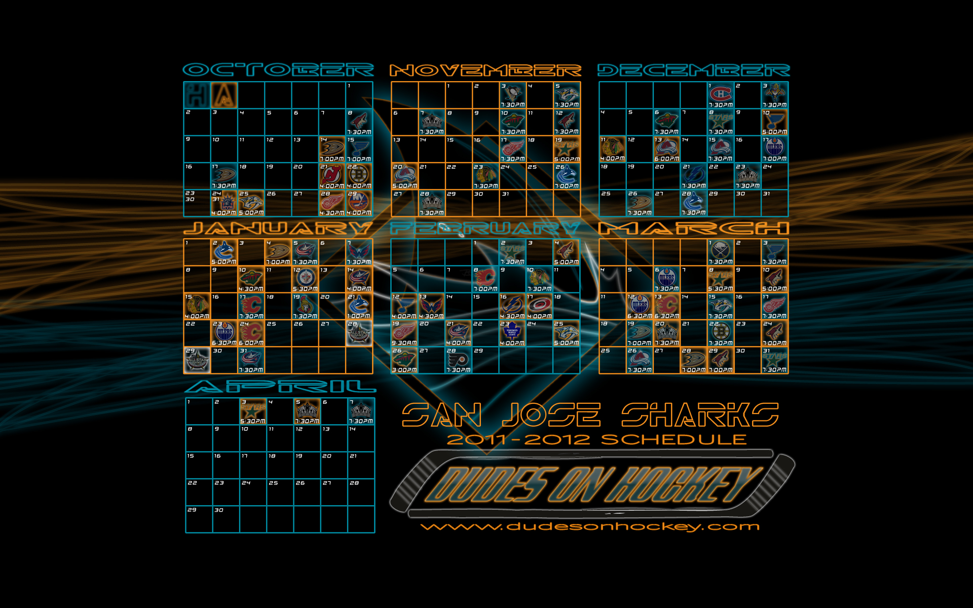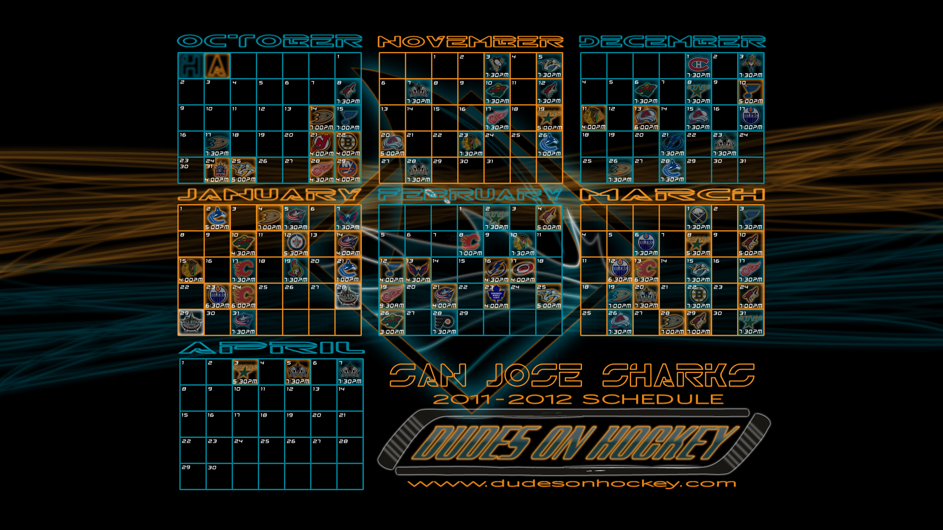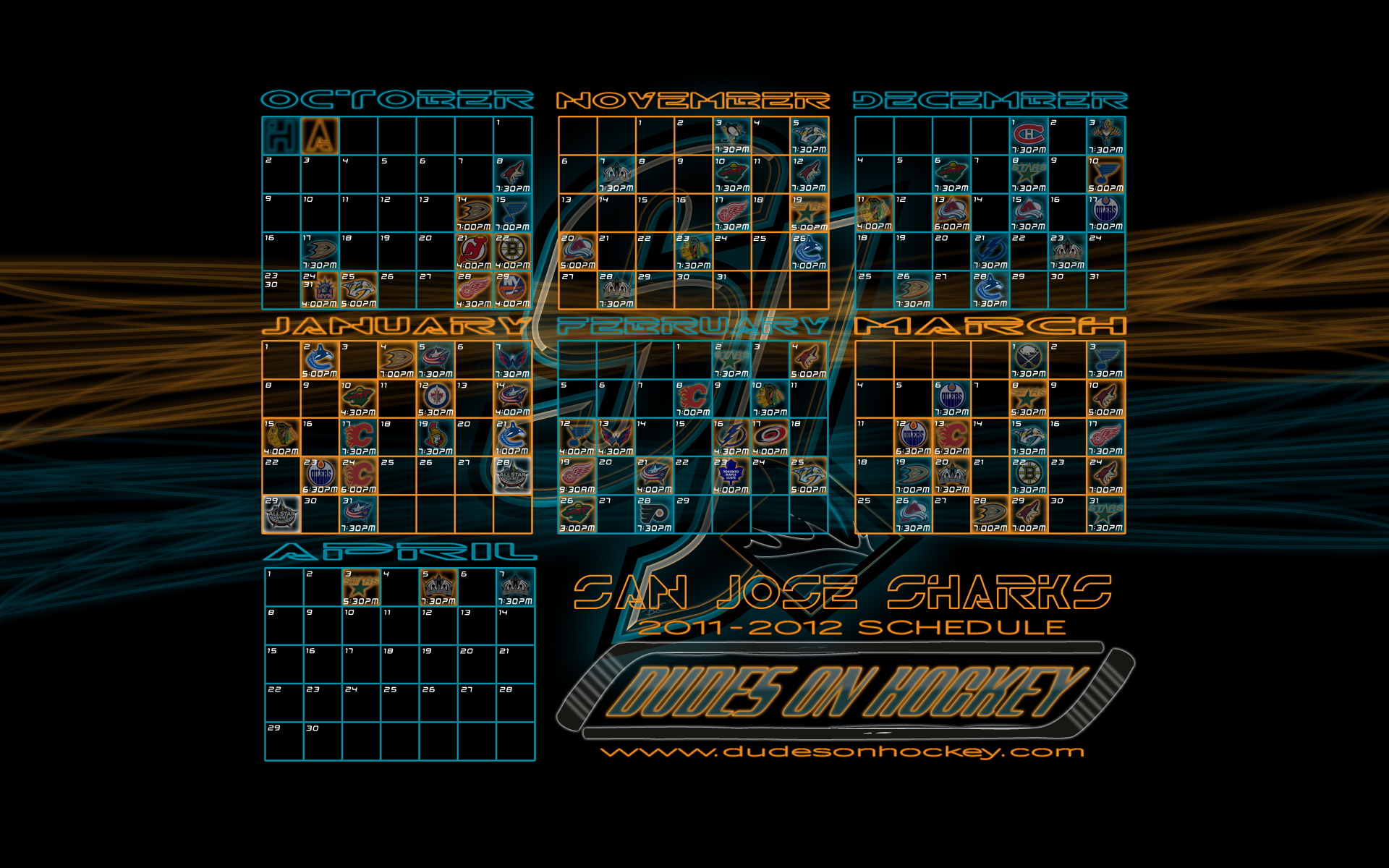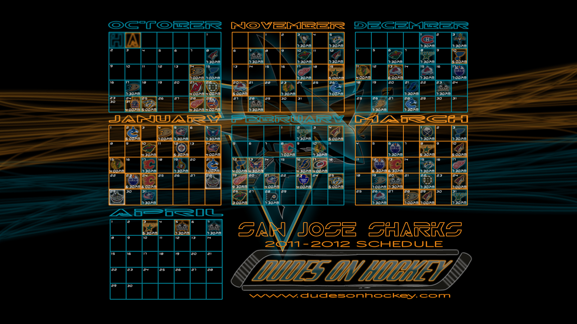 Thanks to my main man Bryce, we now have some desktop wallpapers of the Sharks’ 2011-2012 schedule. Four different backgrounds in two sizes. I’m partial to the diamond fin myself.